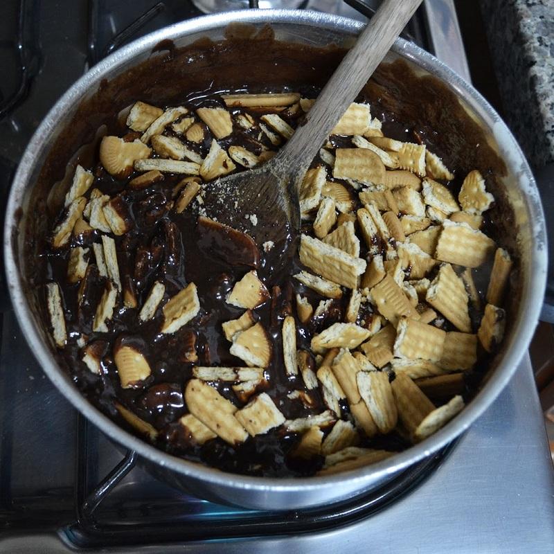 Assim que a massa de brigadeiro começar a desgrudar da panela, retire do fogo e misture os biscoitos partidos. Mexa bem para envolver tudo.