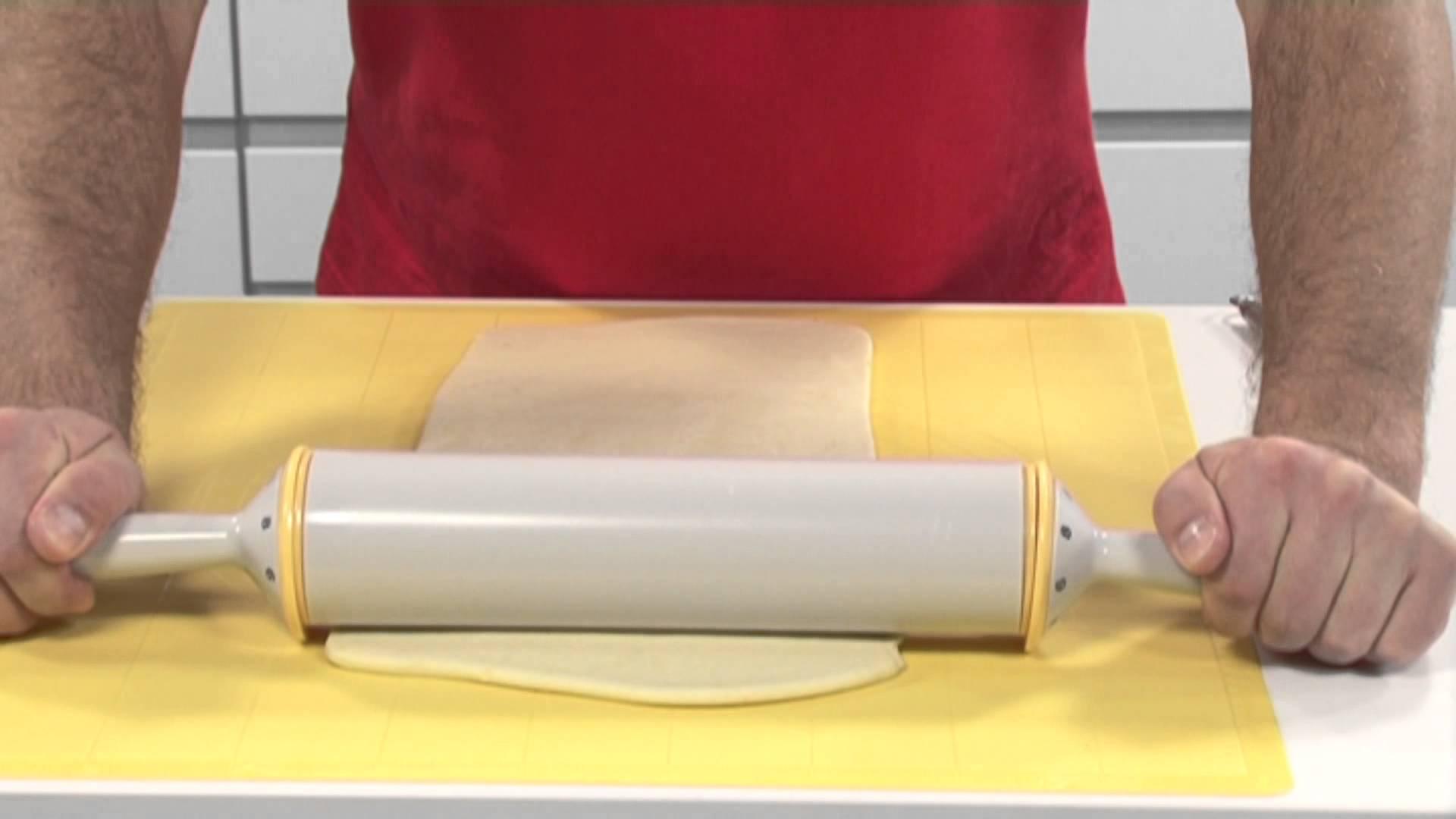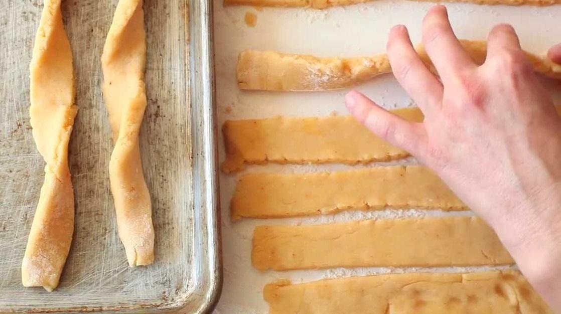 Comece a abrir a massa, de forma a que fique com cerca de meio centímetro de altura. Com uma carretilha ou uma faca, corte tiras fininhas de massa. Torça as tirinhas, enrolando-as sobre si mesmas.