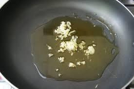Pique ou esmague o alho e coloque em uma frigideira com o azeite ou manteiga, se preferir. Leve ao lume e deixe alourar um pouco. Coloque a salsinha picada.
