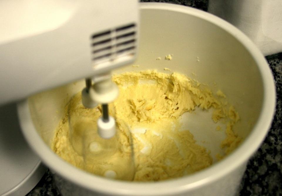 Em outra tigela, coloque o açúcar e a manteiga (já à temperatura ambiente) e bata com a batedeira até obter uma mistura cremosa. Depois adicione o sal e os ovos e bata novamente até estarem todos os ingredientes bem integrados.