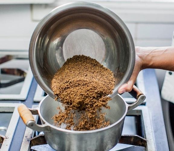 Em seguida acrescente a farinha, o cacau em pó e o bicarbonato, previamente misturados. Volte a mexer tudo muito bem até conseguir uma consistência homogênea.