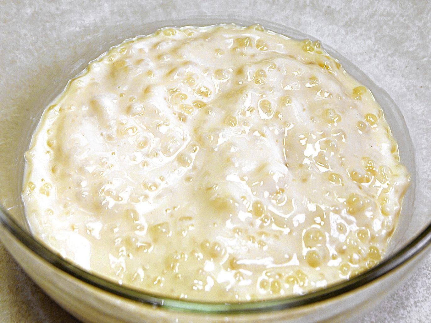 Despeje a farinha de tapioca em uma vasilha e despeje a mistura de óleo e leite por cima, ainda quente da fervura.