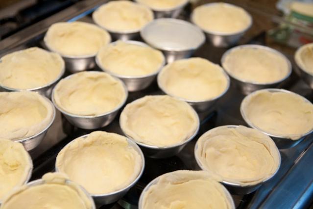 Enquanto deixa o creme esfriar, estenda a massa folhada com um rolo. Se quiser também pode fazer a sua própria massa folhada, entre no nosso artigo e siga as instruções. Forre as formas (sem untar) com a massa folhada, moldando com os dedos.