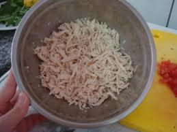 Comece por cozer o peito de frango em água com um pouco de sal. Depois de cozido, espere esfriar um pouco e desfie em pedacinhos bem pequenos.