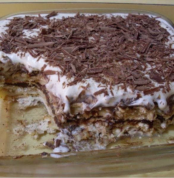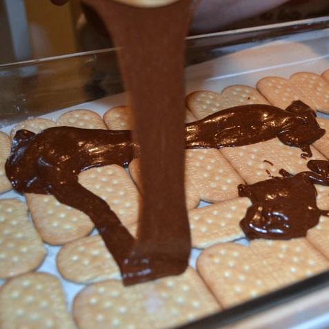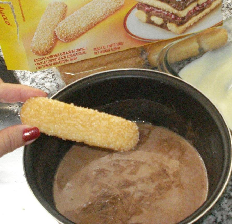 Pegue no refratário dos biscoitos e coloque uma camada do creme de chocolate. Adicione mais uma camada de biscoitos molhados no leite, outra de creme de chocolate e assim sucessivamente até encher todo o refratário.