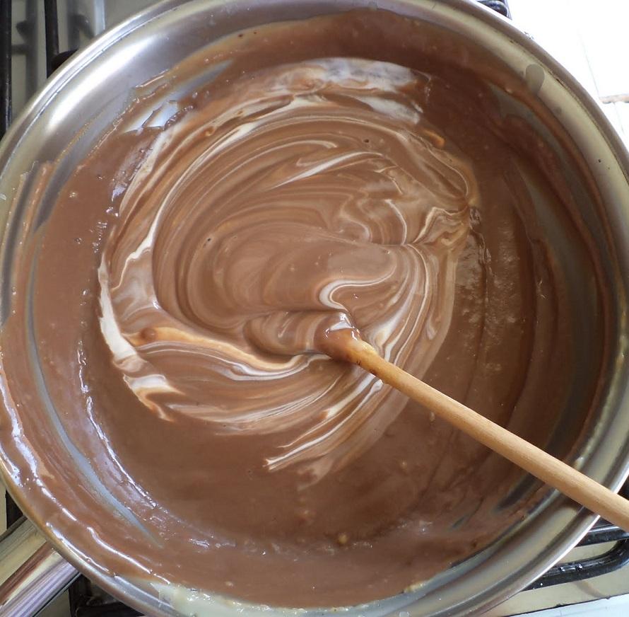 Numa panela ao fogo brando misture todos os restantes ingredientes, mexendo sempre para não queimarem. Quando ferver, desligue o fogo e deixe esfriar. Este será o creme de chocolate.