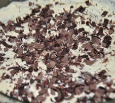 No topo, coloque uma camada do primeiro preparado da cobertura (o dos leites com as gemas) e finalize com a camada das claras batidas em neve. Nivele tudo muito bem e enfeite com raspas de chocolate.