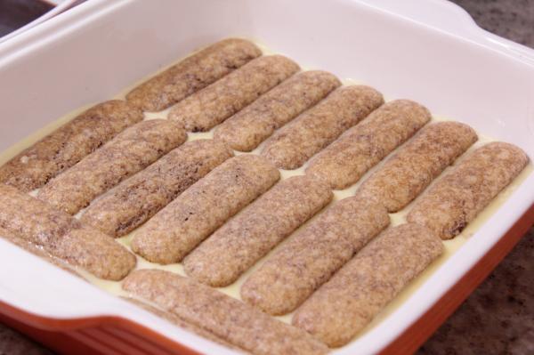 Feito isso, começa a montagem do pavê de pêssego. Disponha as bolachas inteiras, uma ao lado da outra no fundo da travessa que você irá usar até forrá-la.