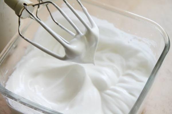 Para preparar a cobertura do pavê de pêssego use as 3 claras e uma batedeira para bater claras em neve. Quando chegar no ponto, acrescente 5 colheres de açúcar, continue batendo e aos poucos adicione o creme de leite. Bata até chegar no ponto de chantili.