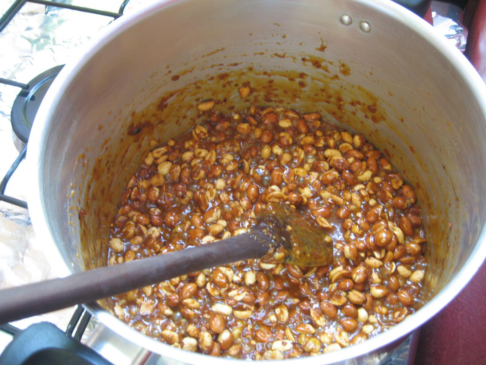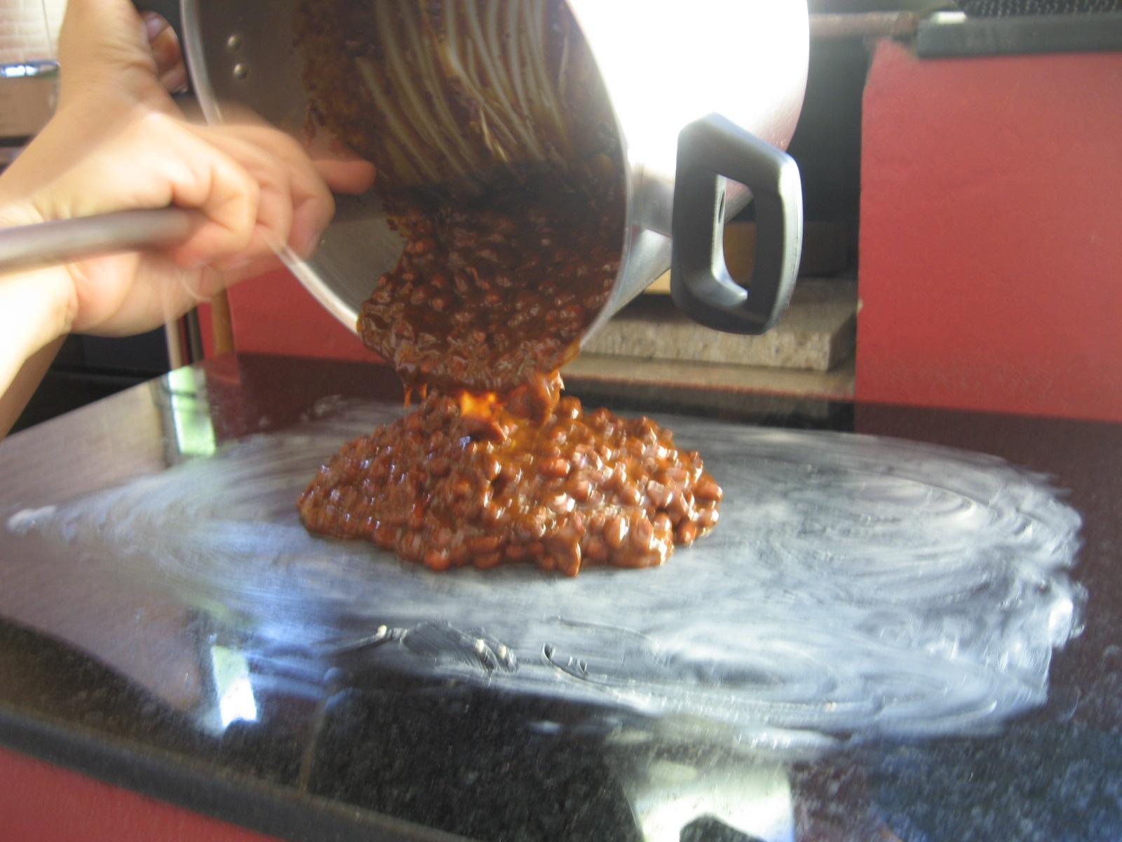 Quando começar a desprender da panela, adicione os amendoins sem pele. Depois desligue o fogo e vá mexendo mais alguns minutos. Verta a mistura sobre uma superfície lisa e dura (o mármore) untada com manteiga e deixe esfriar. O seu pé-de-moleque já se terá desprendido e depois é só cortar em quadrados.