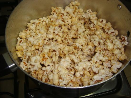 Ligue o fogão a fogo médio e verta as pipocas para dentro da panela. Tampe e deixe estourar, agitando a panela de vez em quando para que todas as pipocas estourem e não queimem no fundo.
