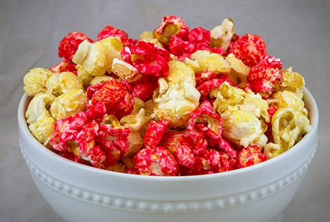 Passado esse tempo, desligue o fogo e acrescente o corante, mexendo para que ele se misture. Quando a sua calda colorida estiver pronta, verta-a sobre as pipocas, mexendo-as para que todas recebam a calda.