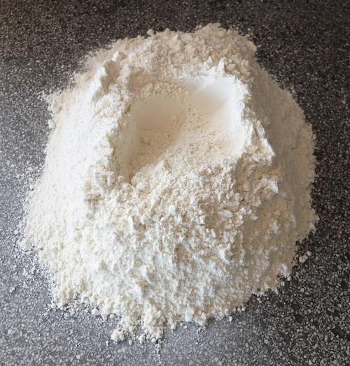 Use uma tigela para misturar todos os ingredientes secos (farinha e sal), com exceção do fermento biológico. Quando estiver misturado esse pó branco, abra um buraco no meio do amontoado.