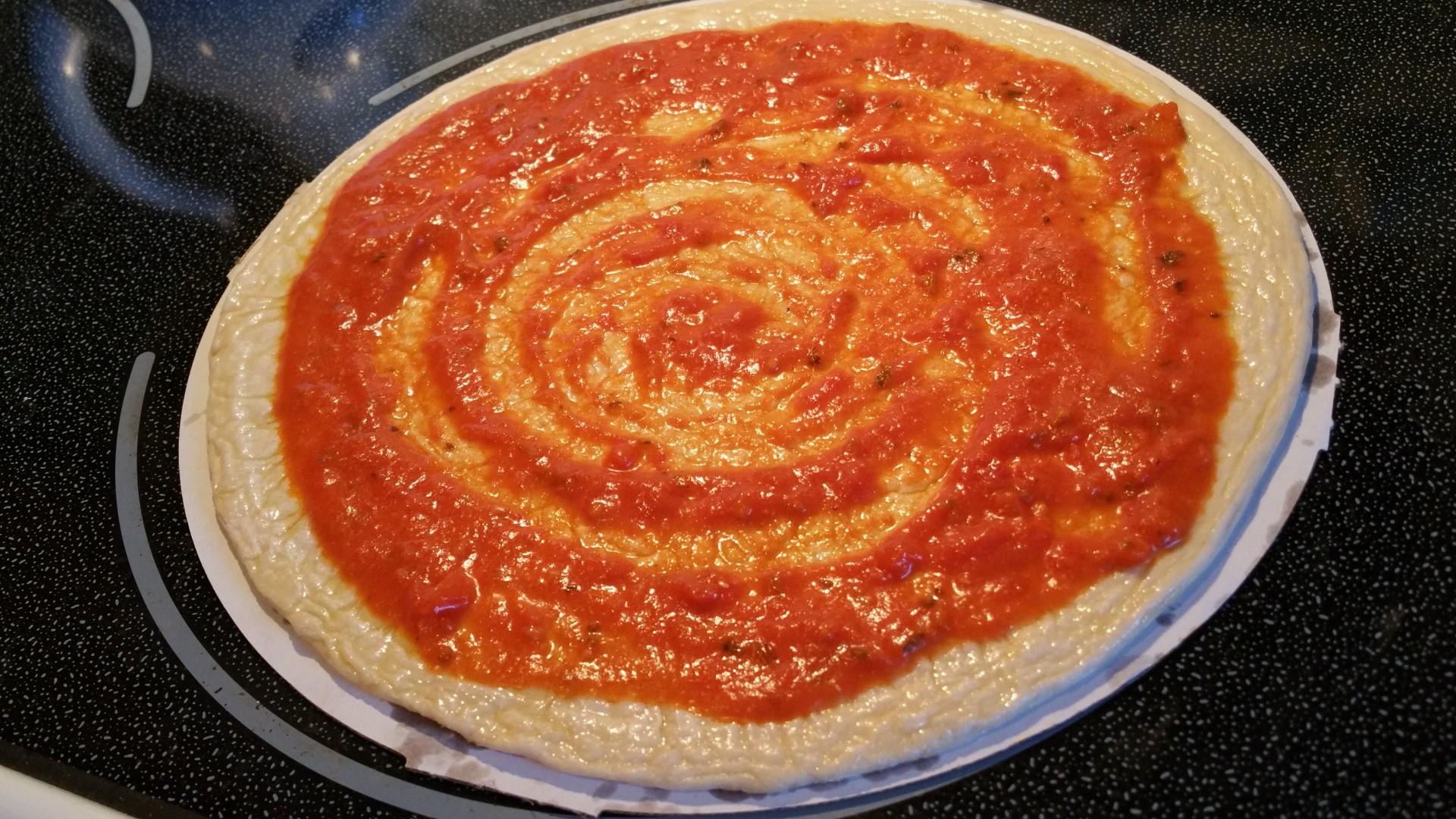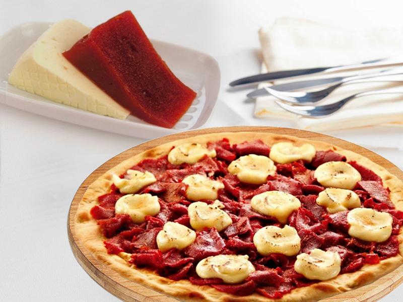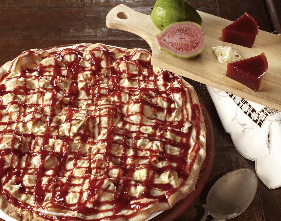 Ao invés do molho de tomate que você usaria em uma pizza tradicional, passe geleia de goiaba sobre a base da pizza.
