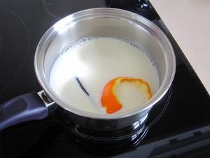 Agora, coloque o leite para esquentar até que esteja a ponto de ferver. Antes de chegar no ponto de ebulição, retire do fogo e acrescente a essência de baunilha e a casca da laranja. Deixe repousar durante cinco minutos e peneire para retirar a casca. A casca da laranja dá um aroma à receita.