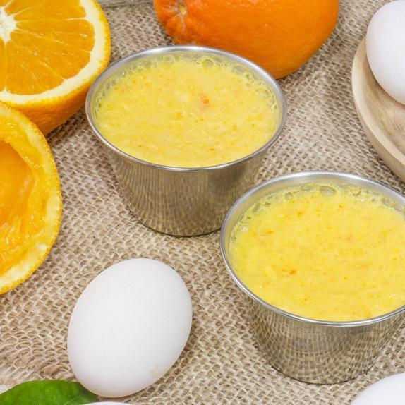 Pegue um recipiente e acrescente as gemas do ovo, os ovos inteiros, o açúcar, as raspas da laranja, o suco, o leite aromatizado preparado no passo anterior e a água-de-flor-de-laranjeira. Se quiser, pode preparar sua própria água-de-flor-de-laranjeira seguindo estes simples passos. Bata tudo à velocidade média até obter uma massa cremosa e espumosa. Se quiser, pode acrescentar uma lâmina de gelatina.