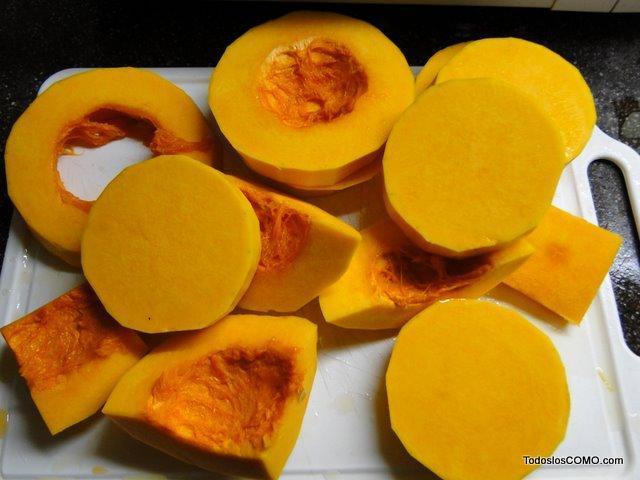 Uma vez que tenha a abóbora descascada, corte-a em rodelas e retire da parte de cima oca as sementes.