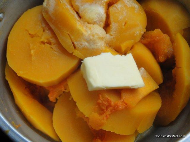 Quando as rodelas estiverem bem tenras, coe muito bem (atenção nessa hora). Depois volte a colocar na panela e adicione a manteiga. Depois esmague a abóbora com um garfo para transformar a abóbora em purê.