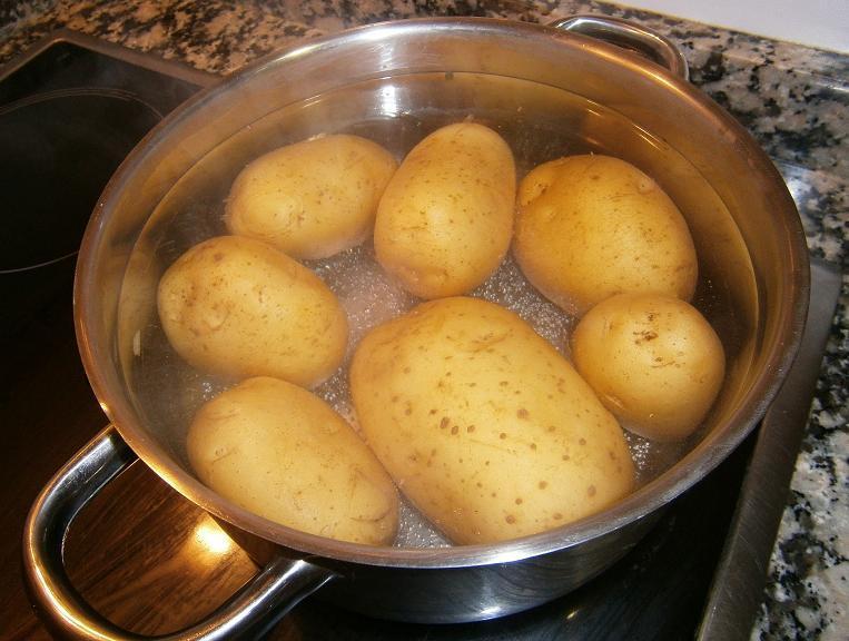 Uma vez que a água tiver fervido, teremos de jogar as batatas inteiras, sem descascá-las, com um pouco de sal. Desta forma, conseguiremos que a batata absorva menos água e conserve o amido. Será necessário deixar as batatas ferverem até que fiquem macias; não há um tempo exato já que variará em função do tipo e do tamanho das batatas, pelo que você deverá ir espetando com algum utensílio para comprová-lo.
