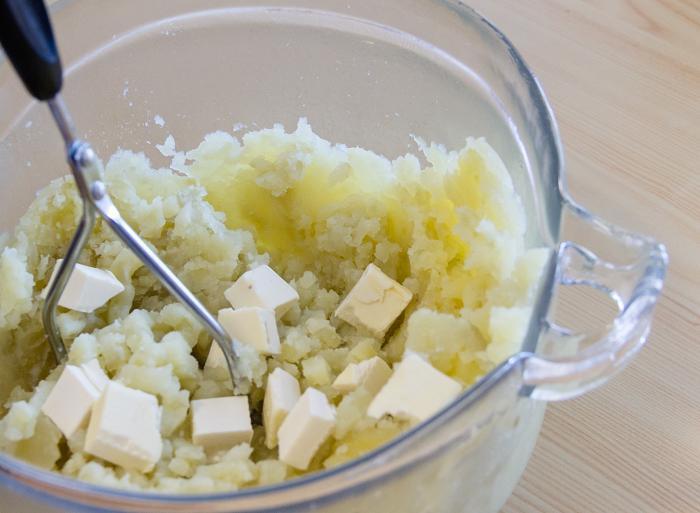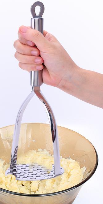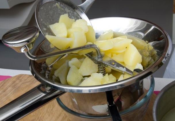 Se preferir, você também pode usar um triturador manual de batatas -potato masher, em inglês- para fazer o purê ou, se não dispuser destes utensílios, poderá amassar as batatas com um garfo. Este trabalho pode demorar um pouco, mas você deverá garantir que todos os pedaços de batata fiquem bem esmagados para não formar grumos.