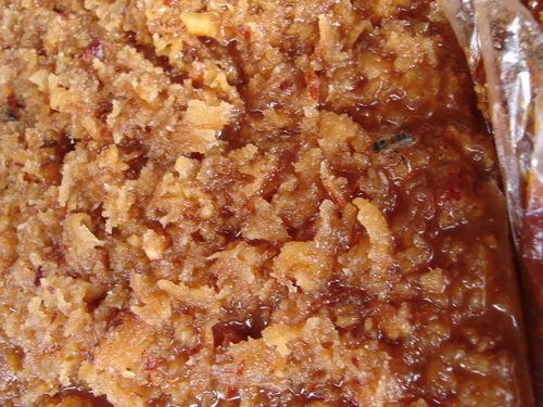 Quando o açúcar estiver todo derretidinho igual a caramelo, você pode juntar o coco em pedaços, ele vai fritar no caramelo, mais uma vez você não deve parar de mexer, deixe evaporar toda a água que o coco vai libertando.