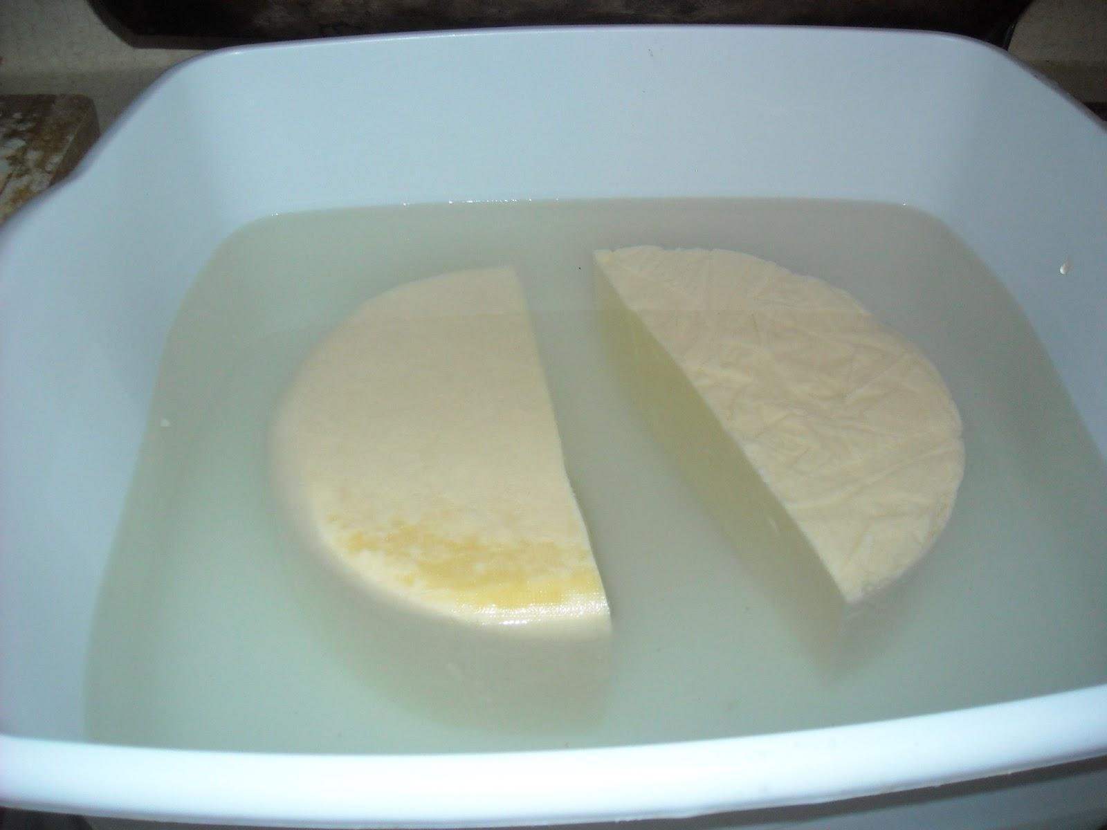 Faça uma solução de salmoura com 300 g de sal e 800 ml de água. Remova o queijo prensado, removendo também o pano, e mergulhe-o em água salgada por 12 horas. Deixe o queijo esfriar na geladeira.