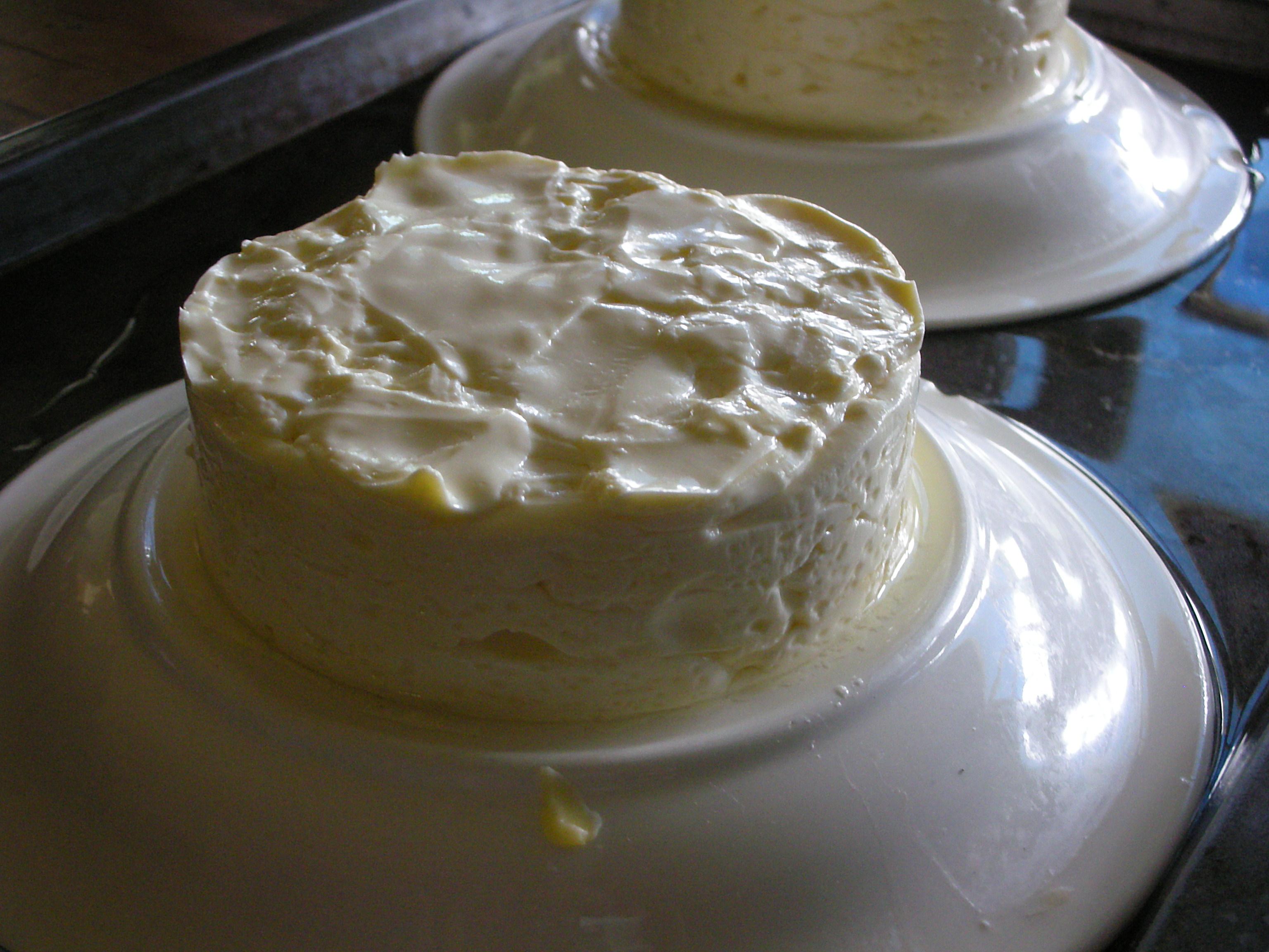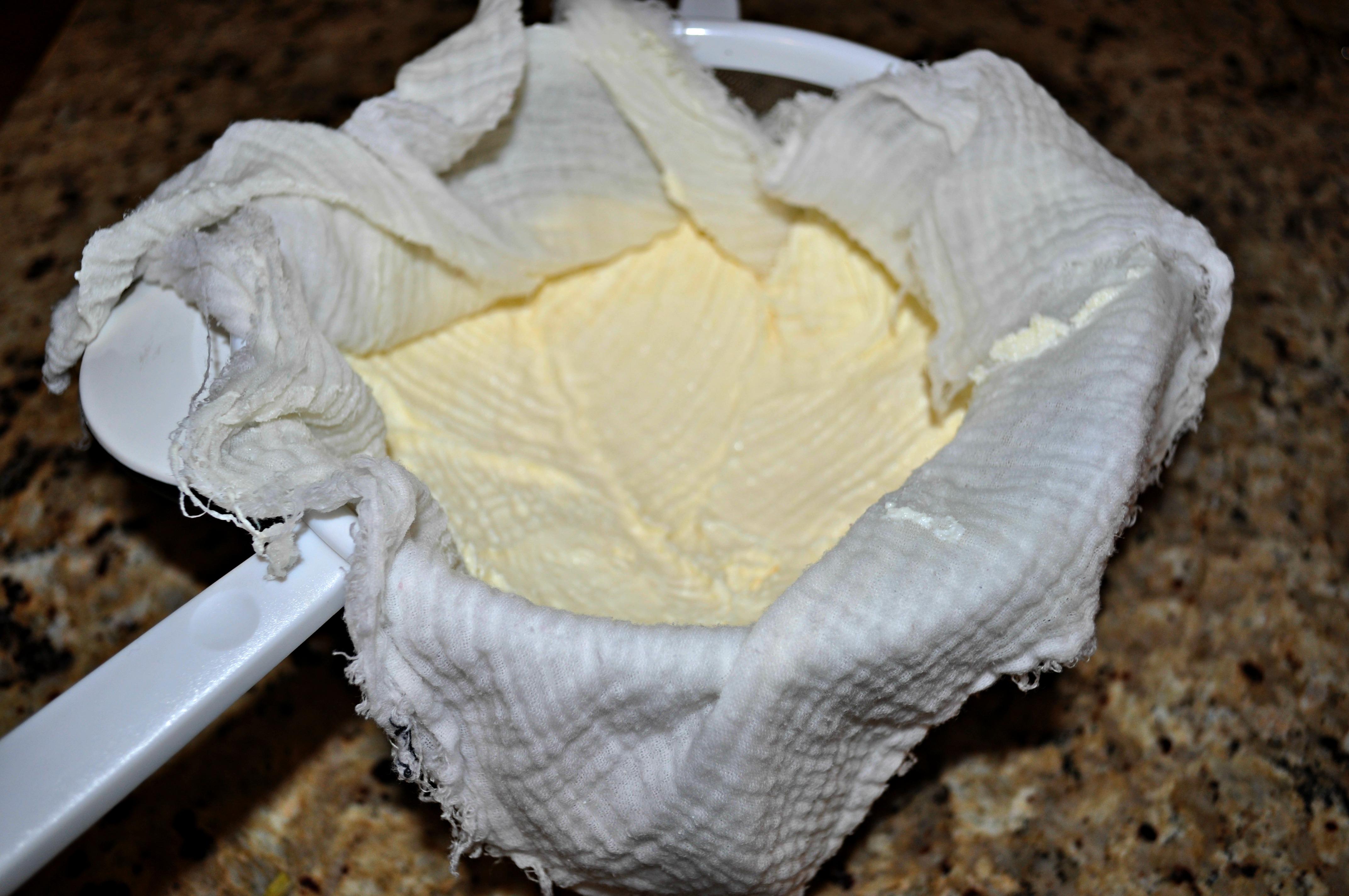 Revista uma cesta de queijo com um pano leve e limpo. Preencha-a com a coalhada ainda quente. Faça este processo de forma rápida para evitar quebrar a coalhada e pressione o queijo (com cerca de 18 kg) durante 20 minutos.