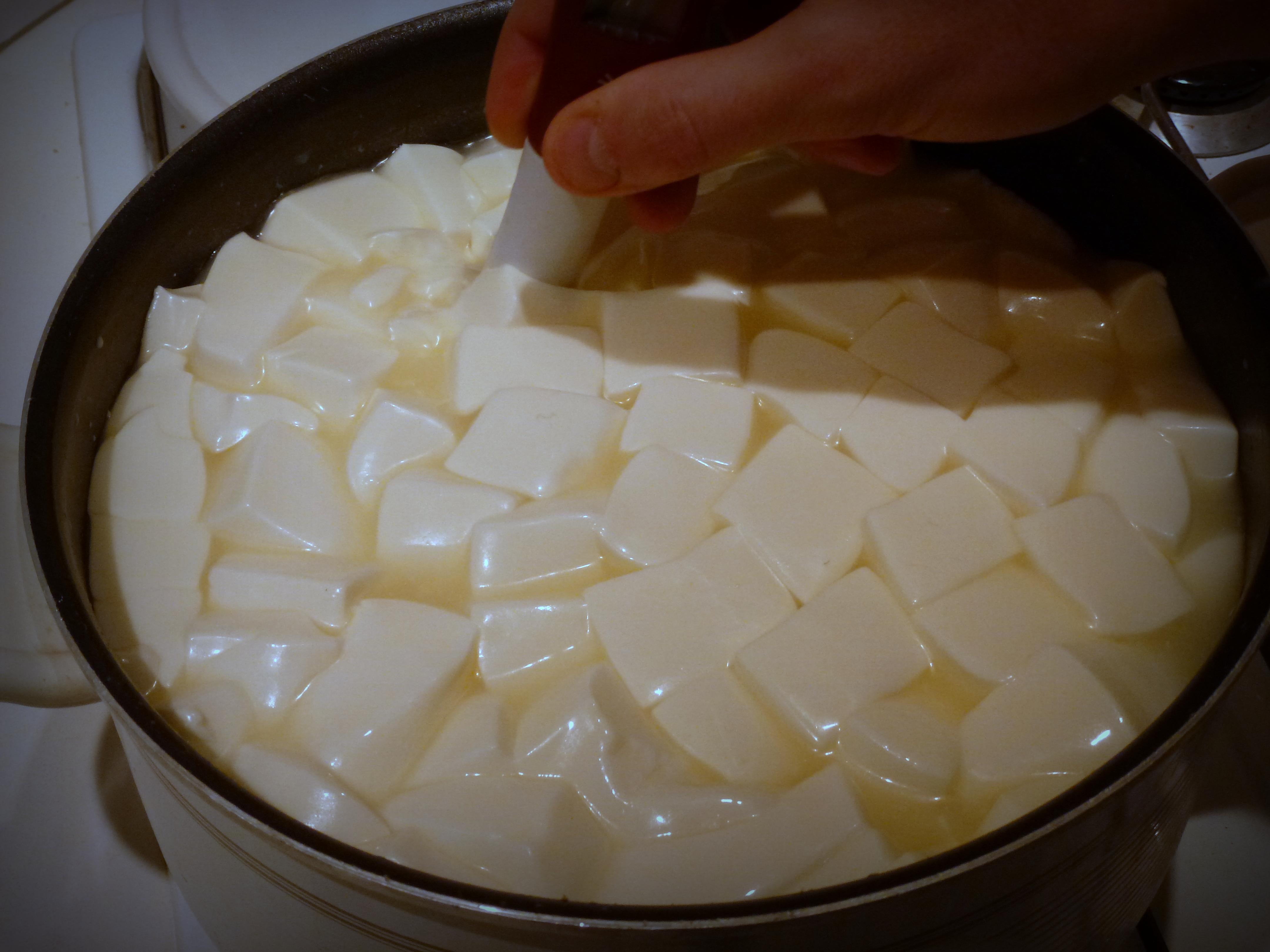 Para cortar a coalhada, use uma faca comprida para cortar todo o requeijão em tiras. Repita o processo na direção perpendicular aos primeiros cortes para formar cubos. Deixe os cubinhos descansarem por dez minutos.