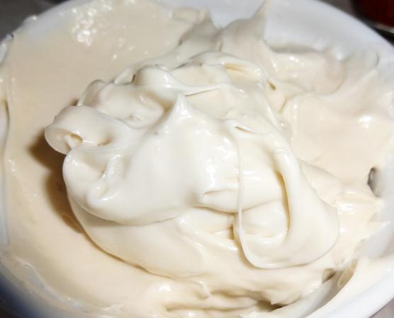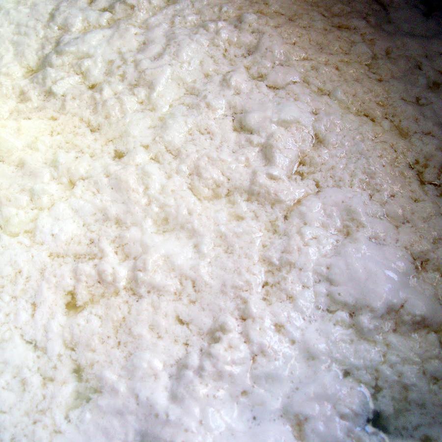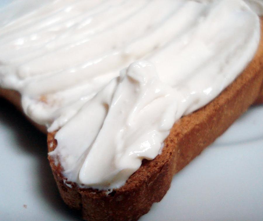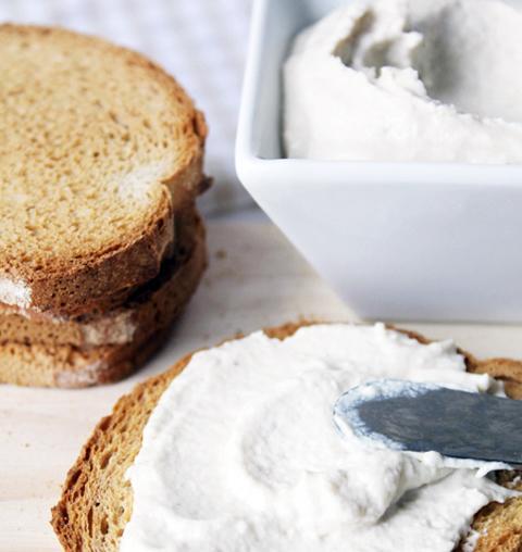Depois de 12 horas, você vai ver que a mistura virou uma massa espessa e granulada. Coloque em um recipiente e bata. Com a batedeira, robô de cozinha, etc., a massa espessa vai virar um cremoso queijo para untar.