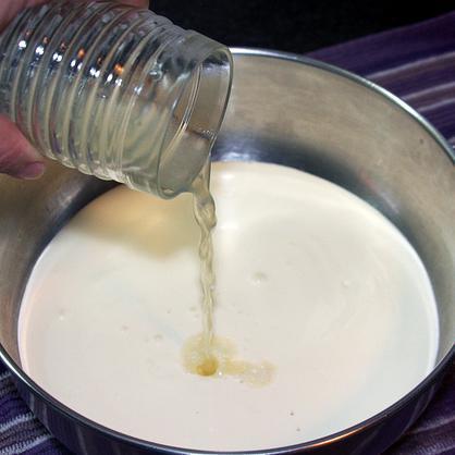 Para fazer queijo para untar caseiro, quando a mistura estiver quente, sem chegar a ferver, apague o fogo mas não retire a panela. Em uma xícara, dissolva a coalhada em pó com um pouco de água e acrescente à mistura.
