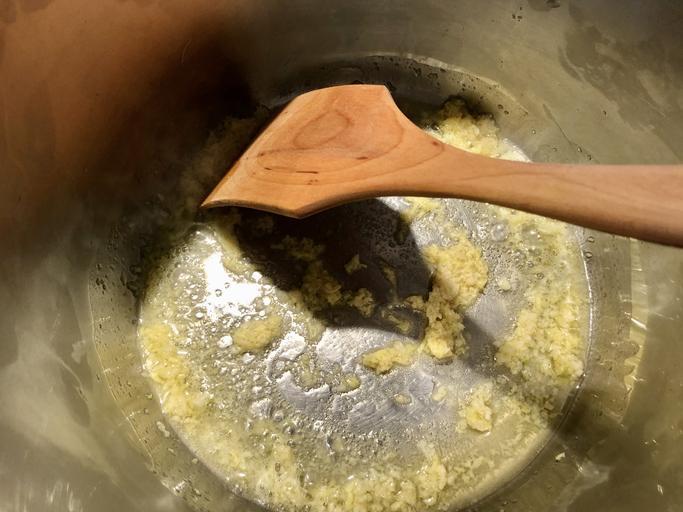 Em uma frigideira, aqueça o azeite e a manteiga. A seguir, adicione 1 ou 2 dentes de alho bem picadinhos. Deixe que dourem por alguns minutos, para evitar que queimem,