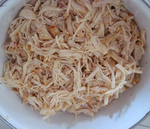 Deixa cozinhar e, quando estiver pronto, coe a água conservando um pouco de caldo e deixe o frango esfriar um pouco. Depois você deverá desfiar o frango retirando os ossos e a pele, quanto mais desfiado estiver mais saborosa ficará a reina pepiada.