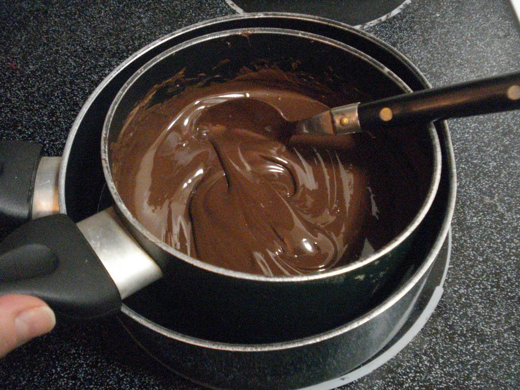 O passo seguinte inclui a preparação do recheio. Coloque água em uma panela e coloque outra panela menor por cima, de forma a derreter o chocolate em, banho-maria. Para saber mais sobre esse procedimento, acesse esse artigo que explica o que é o banho-maria.
