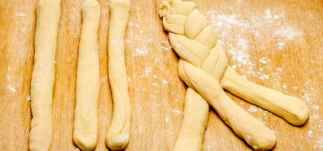 Na sequência, é preciso dividir a massa em quatro porções iguais, sendo que aqui a ideia é fazer duas tranças. Numa superfície enfarinhada é preciso enrolar cada parte até que fique bem alongada e, depois, duas partes devem ser cruzadas como uma trança. Elas precisam descansar novamente para que dobrem de volume. No forno pré-aquecido devem assar por meia hora.