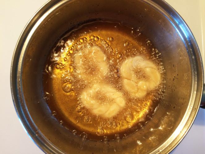 Quando o óleo estiver bem quente, com cuidado, coloque as rosquinhas na gordura e deixem fritar até que fiquem douradas. Se todas não couberem de uma vez na panela, faça aos poucos. Quando tirá-las, coloque sobre papel toalha.