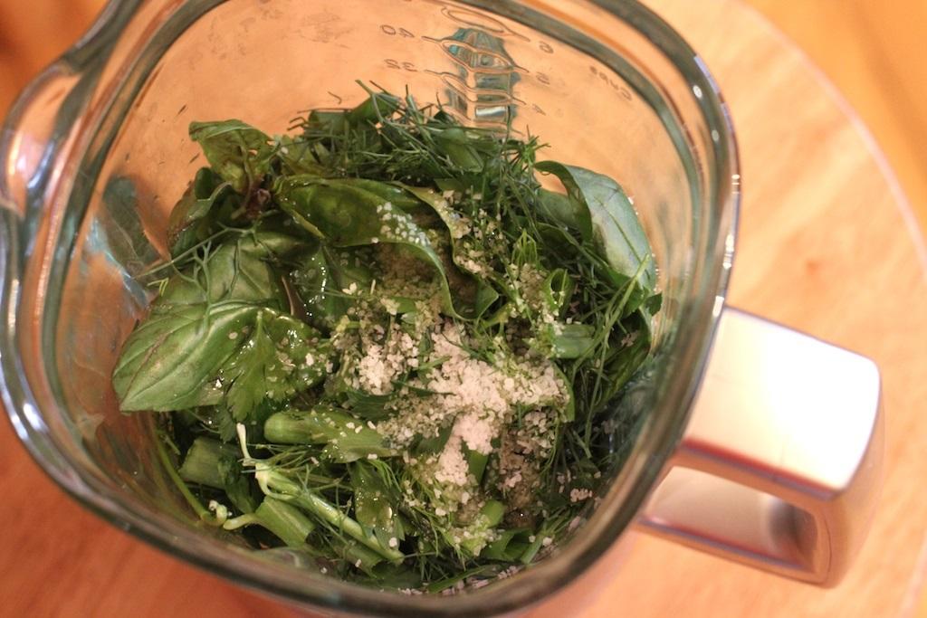 Coloque a mistura de ervas no liquidificador ou no mixer e acrescente o sal.