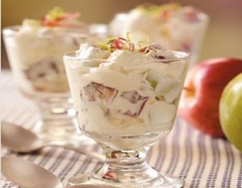 Antes de colocar na geladeira devemos incorporar à salada de maçã o creme chantili, bastante, para que os ingredientes não fiquem secos. Depois de incluir o creme, então sim podemos colocar as tigelas na geladeira porque esta salada deve ser servida fria ou, ao menos, fresca, mas nunca à temperatura ambiente.