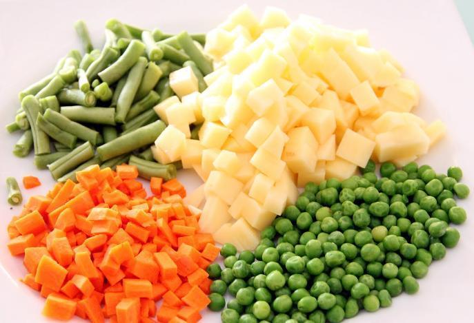Enquanto a água esquenta, você deverá ir cortando em quadradinhos as batatas e cenouras, bem como as vagens em pedaços pequenos. É uma tarefa um pouco trabalhosa, mas vale a pena para conseguir uma saborosa salada russa caseira.