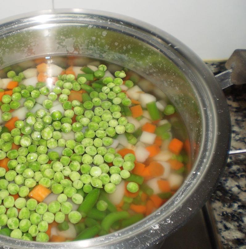 Assim que a água ferver, a primeira coisa que você deverá colocar na caçarola são as batatas e as cenouras. Você pode optar por cozer as vagens e as ervilhas em outra panela à parte ou acrescentá-las quando as batatas estiverem na metade do cozimento, já que demoram mais para ficar prontas. Quando todas as verduras estiverem bem cozidas, você deverá apagar o fogo e escorrê-las com a ajuda de um escorredor ou coador.