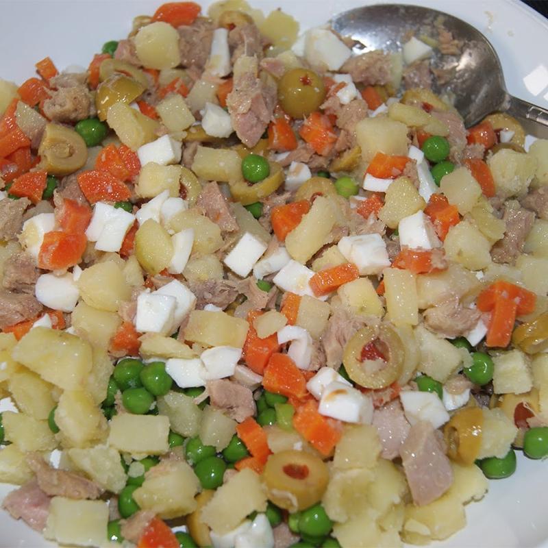 O passo seguinte para preparar a salada russa será cortar os ovos em pedaços pequenos ou ralá-los, se assim o preferir e misturá-los com as verduras cozidas em uma tigela ou recipiente grande. Por último, você também deverá adicionar o atum em conserva -tendo retirado previamente o azeite- e misturar tudo muito bem.