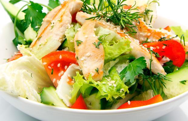 Lave os legumes, coloque a alface partidinha e o agrião numa saladeira. Corte os tomates cereja ao meio e fatie o pimento, disponha-os na saladeira. Junte o pepino finamente cortado às rodelas e os peitos de frango cortados em tiras. Se você dispensar a carne pode comer a saladinha verde sem o peito de frango grelhado, ficando uma refeição ainda mais leve.