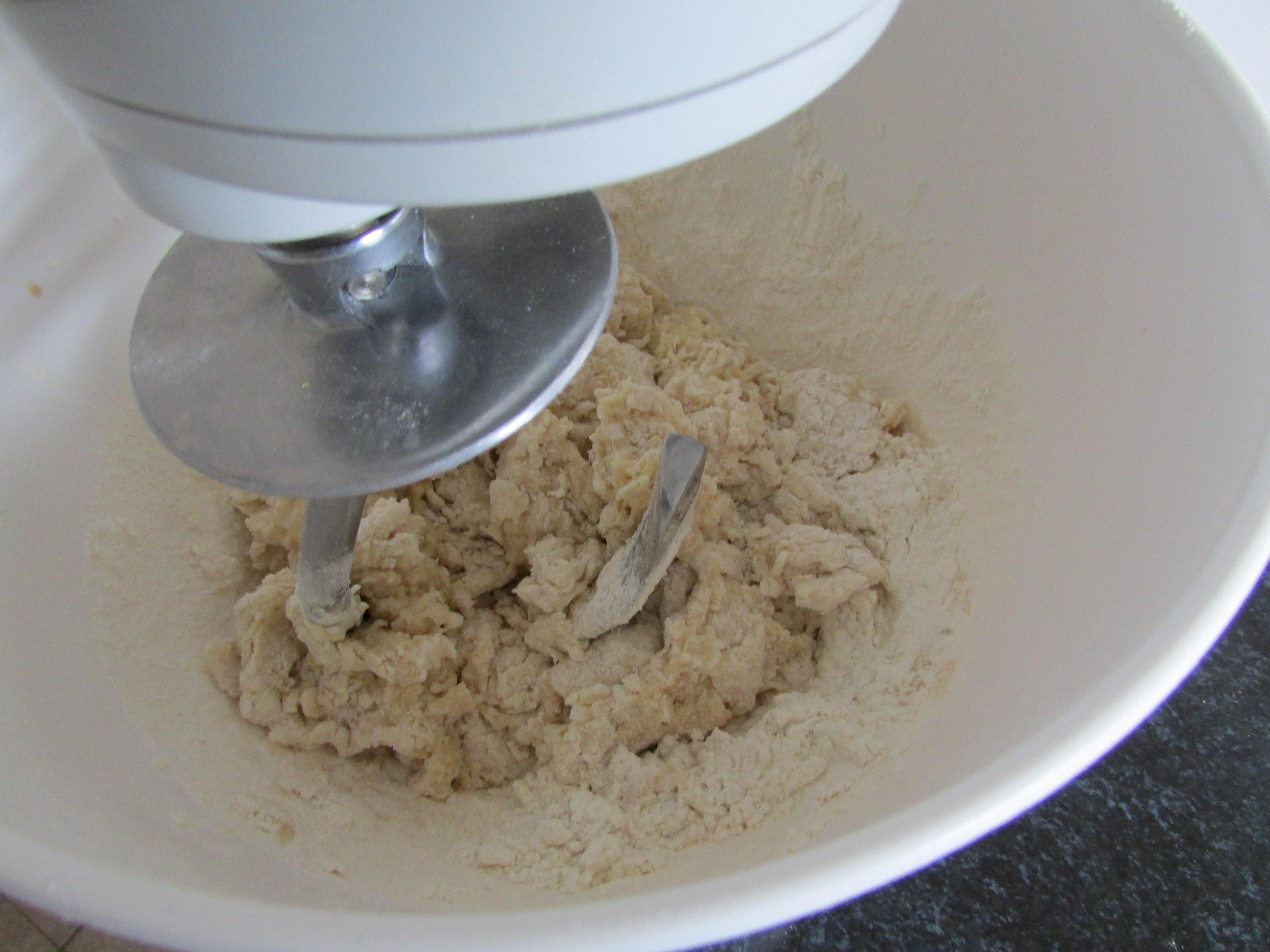 O primeiro passo é fazer a massa, se você tiver uma batedeira própria para fazer massa de pão, são aquelas batedeiras que têm um gancho, você pode usar essa mesma, assim não suja a bancada nem as mão. Caso não tenha você vai ter que sovar a massa na bancada mesmo, depois de misturar os ingredientes. Coloque num recipiente alto de batedeira a farinha e o fermento biológico, junte o leite em pó e o açúcar.