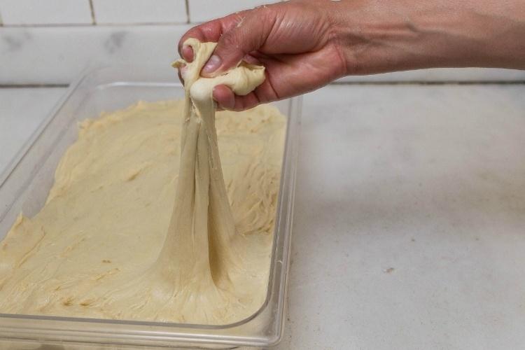 Se você não tiver a batedeira, misture todos os ingredientes e quando estiver uma pasta, coloque numa superfície enfarinhada e sove bastante até a massa ficar bem macia. Divida a massa dos sonhos de doce de leite em 10 pedacinhos iguais, forme bolinhas com as mão.