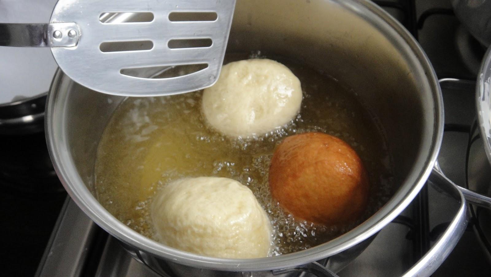 Enquanto os sonhos de doce de leite estão no forno, vá aquecendo o óleo, ele não deve estar muito quente quando fritar os sonhos. Quando passar o tempo das bolas estarem no forno deve retirá-las e fritá-las de seguida.