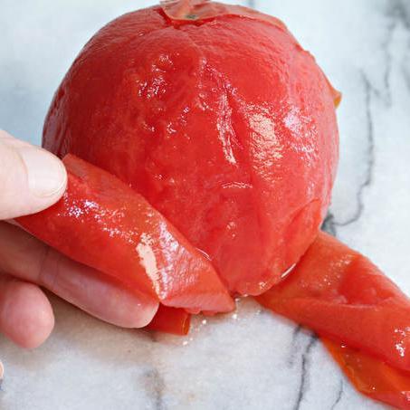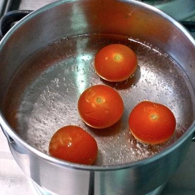 Agora, pegue outra panela com a capacidade suficiente para acrescentar todos os tomates, encha de água e coloque para ferver. Quando a água estiver fervendo, adicione os tomates e deixe durante um minuto, aproximadamente, para escaldá-los. É fundamental que estes vegetais estejam maduros para obter um sabor mais intenso.