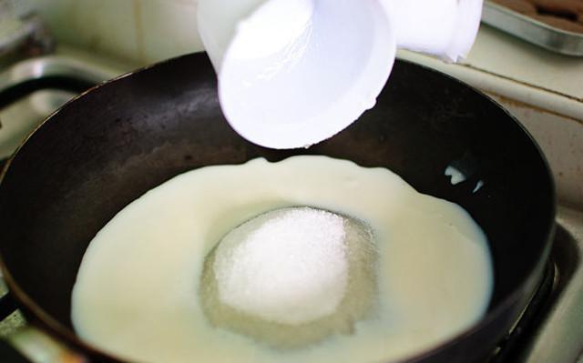 Esquente-a em fogo médio/baixo e misture 1 xícara de açúcar, 1/2 xícara de leite e 1 xícara de creme de leite, até começar a ferver. Quando a mistura borbulhar e tiver atingindo o ponto de ebulição retire do fogo com muito cuidado.