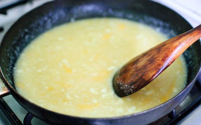 Coloque a frigideira no fogo e mexa até que a mistura engrosse, o que vai demorar por volta de 4 minutos. Após este tempo, retire a mistura do fogo. É importante que este passo seja feito com rapidez para evitar que a mistura acabe muito líquida, como uma espécie de creme.