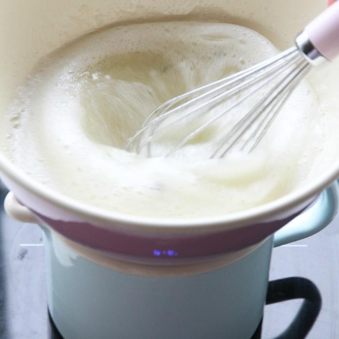 Quando a água estiver fervendo, coloque o recipiente com o açúcar e as claras sobre ela e bata tudo com um batedor de claras manual energicamente. Você deverá bater até que o açúcar se tenha dissolvido completamente e as claras estejam começando a adquirir o ponto de neve. Você deverá fazer isto durante 5 minutos.