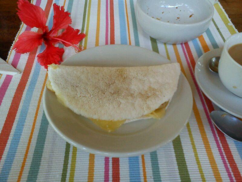 Após a massa de tapioca dobrada estar cozinhada retiramos para um prato e repetimos o processo até acabar os ingredientes. Prontinho, tapioca granulada na frigideira para si e para os amigos, poucas calorias e rápido de fazer. Está na hora do jogo.