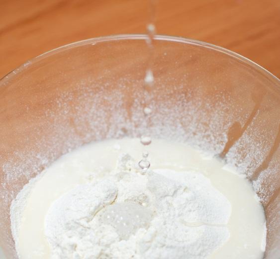 O primeiro passo para fazer tempura de abobrinha é misturar a água com gás bem fria com a farinha e uma pitada de sal. Deverá conseguir uma massa homogênea e, apesar de poder usar diretamente, o mais apropriado é deixar repousar por uma hora na geladeira.